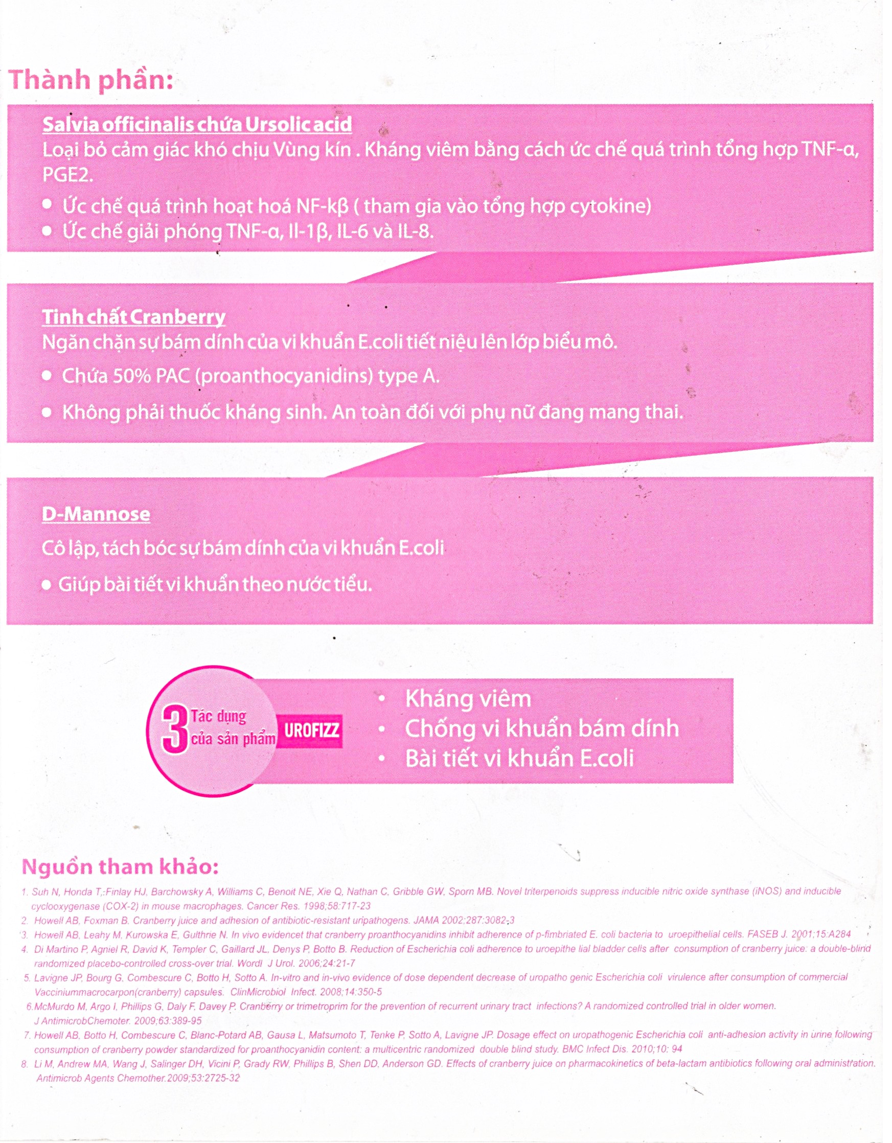 Công dụng: Tăng sức khỏe đường tiết niệu (Đúng theo nội dung giấy phép BCB nêu trên). Giúp kháng viêm giảm đau vùng kín, chống vi khuẩn bám dính, bài tiết E.coli qua đường nước tiểu.